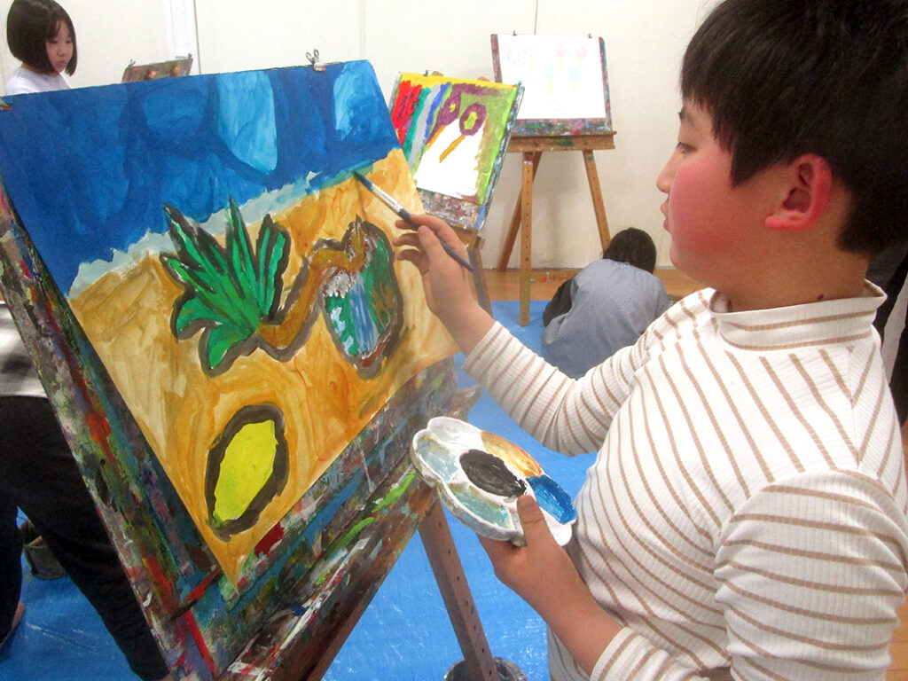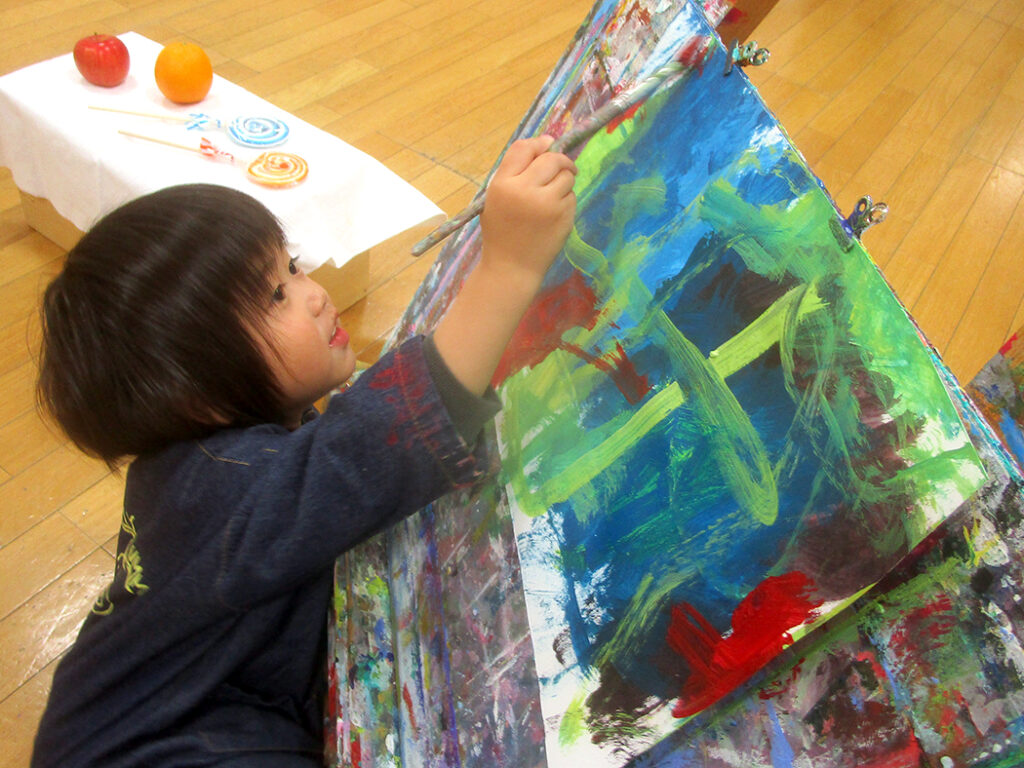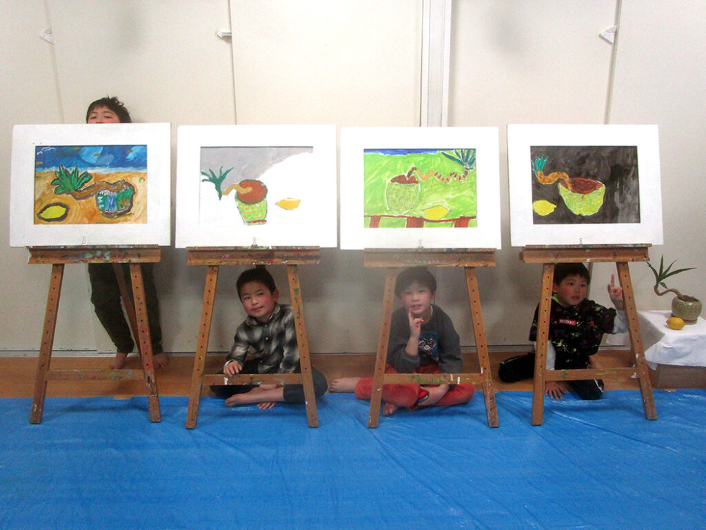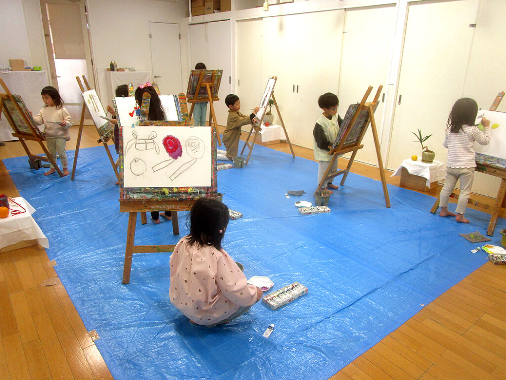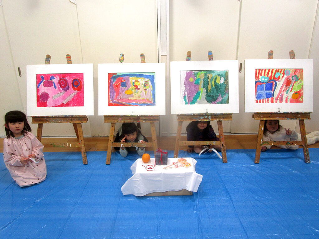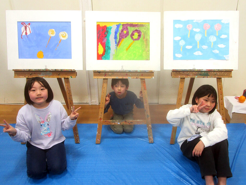 まずは体いっぱいロープ遊びで、線の世界を感じ取ったら絵画の開始です。今回はキャンディーや植物など線を感じられるモチーフです。画用紙に木炭で下描きをしてアクリル絵具で着彩。子ども達の人数分の答えが生まれます。今回も魅力あふれる世界がたくさん生まれました⭐︎