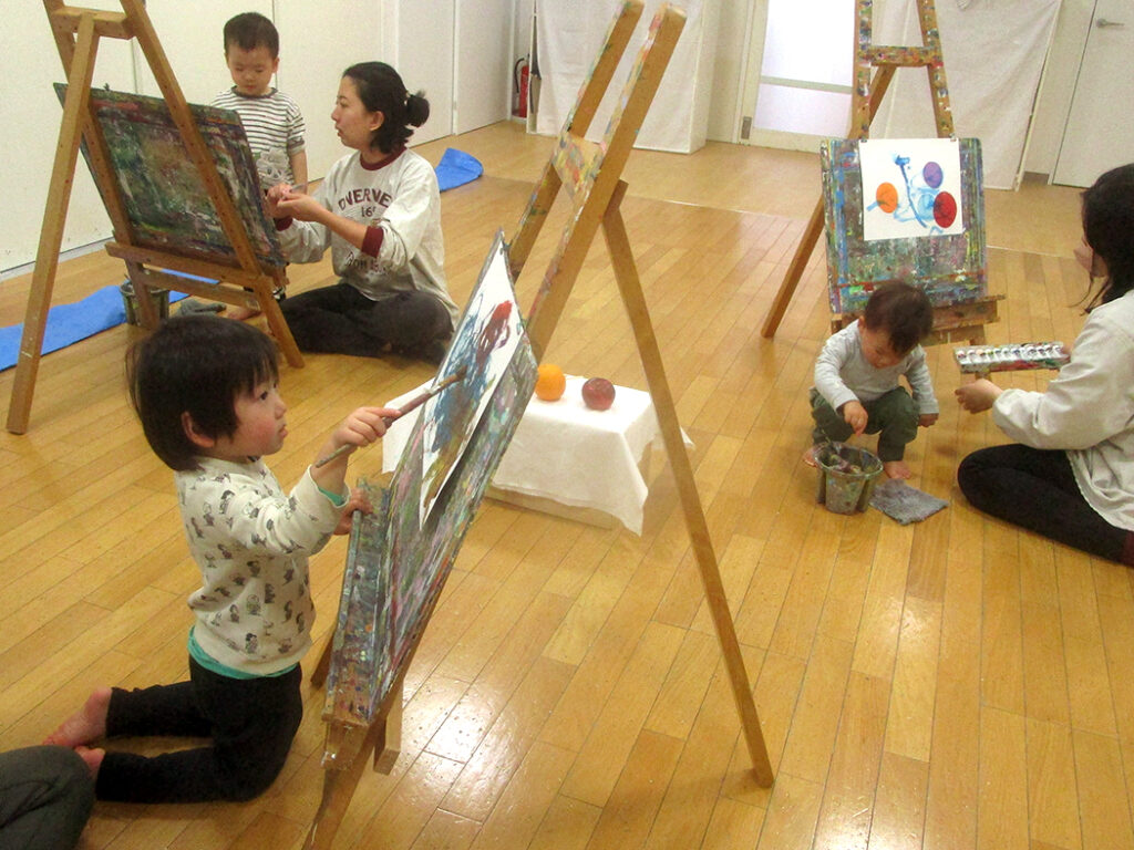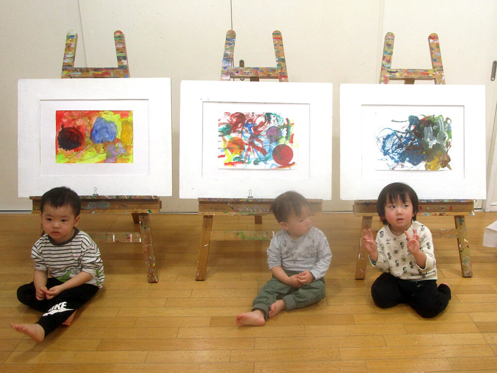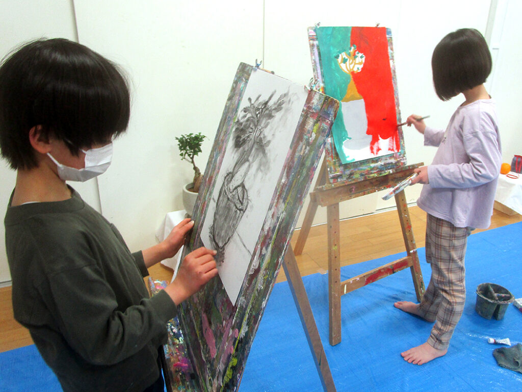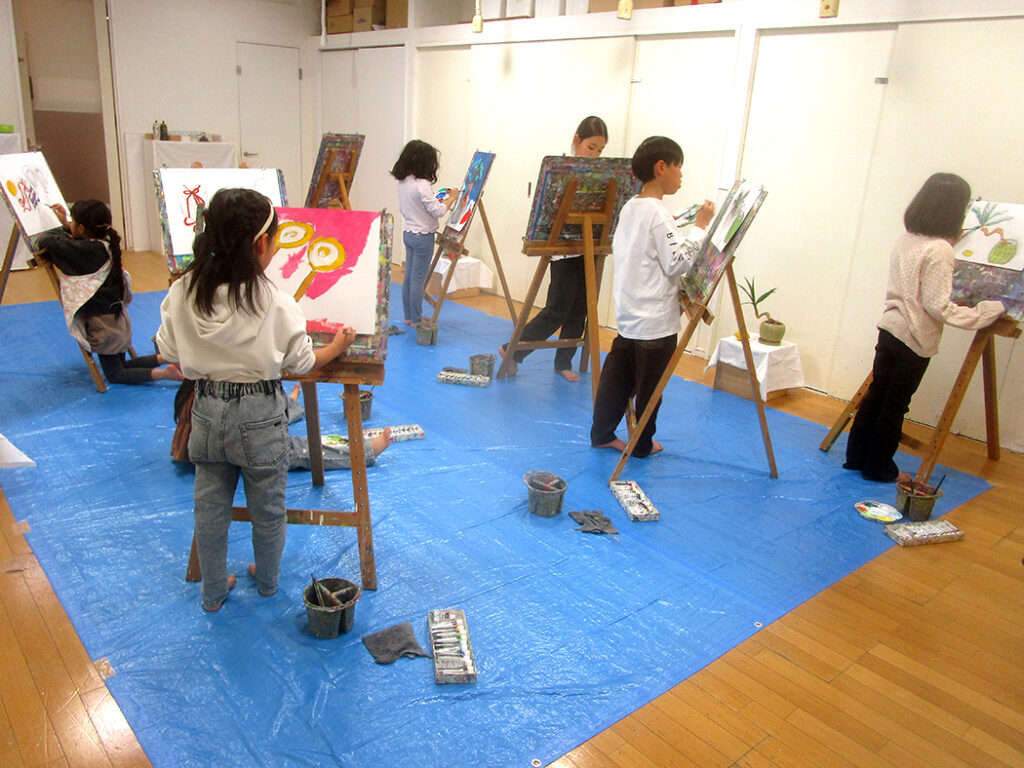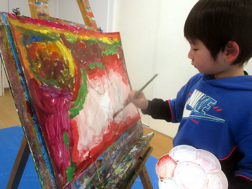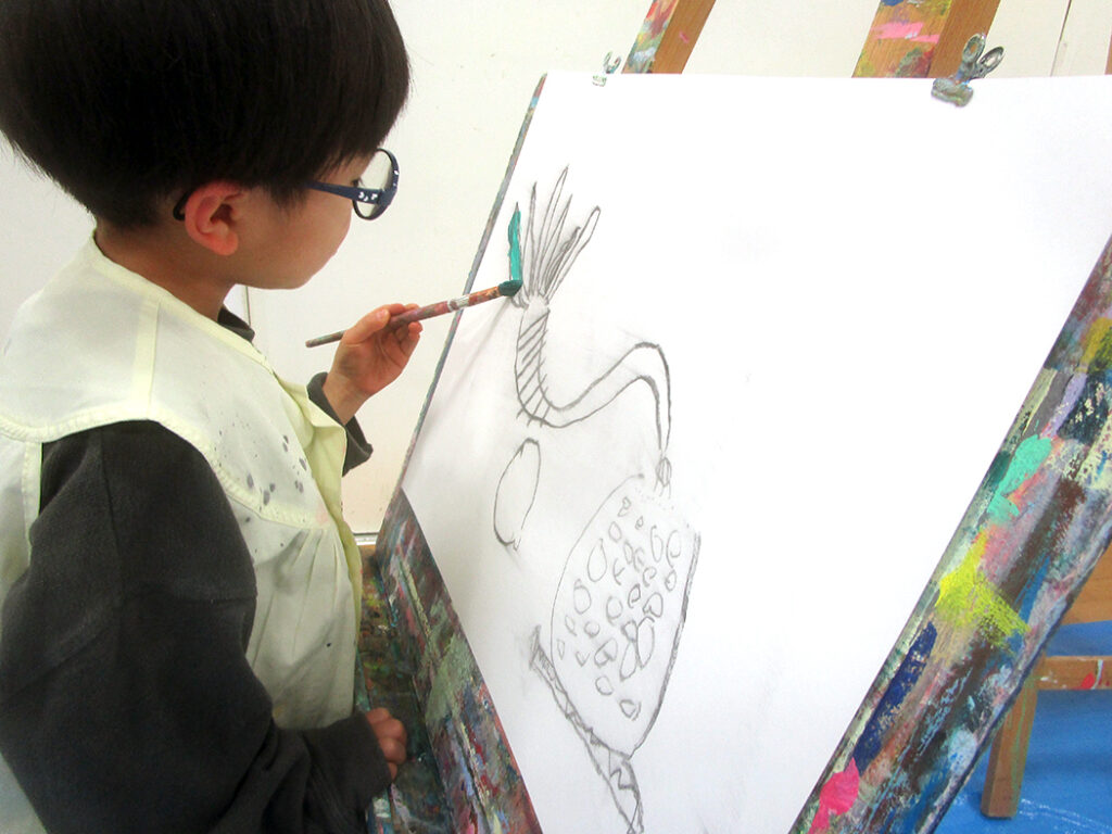 まずは体いっぱいロープ遊びで、線の世界を感じ取ったら絵画の開始です。今回はキャンディーや植物など線を感じられるモチーフです。画用紙に木炭で下描きをしてアクリル絵具で着彩。子ども達の人数分の答えが生まれます。今回も魅力あふれる世界がたくさん生まれました⭐︎