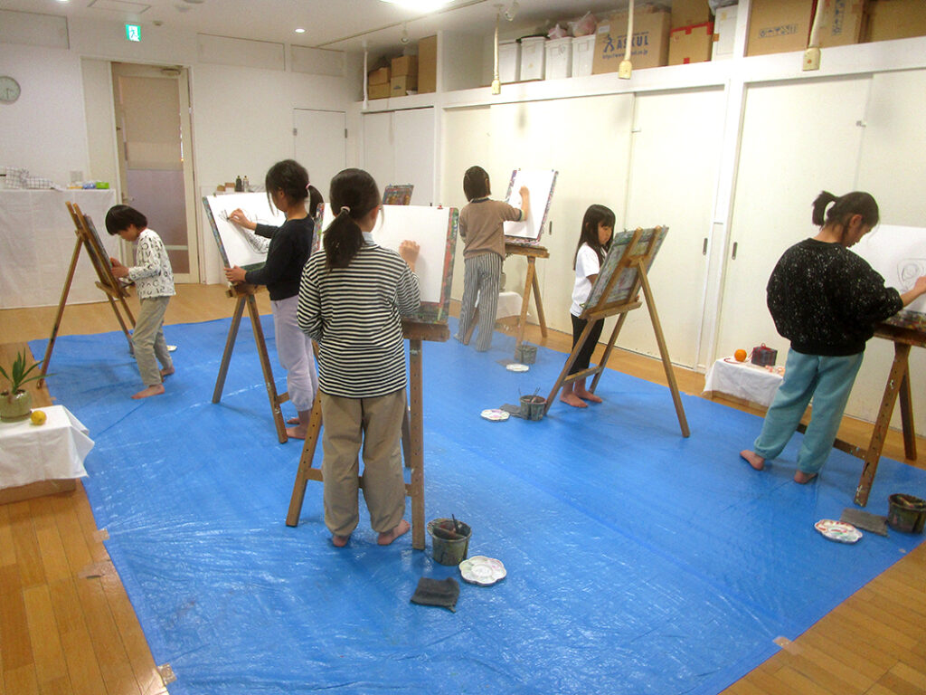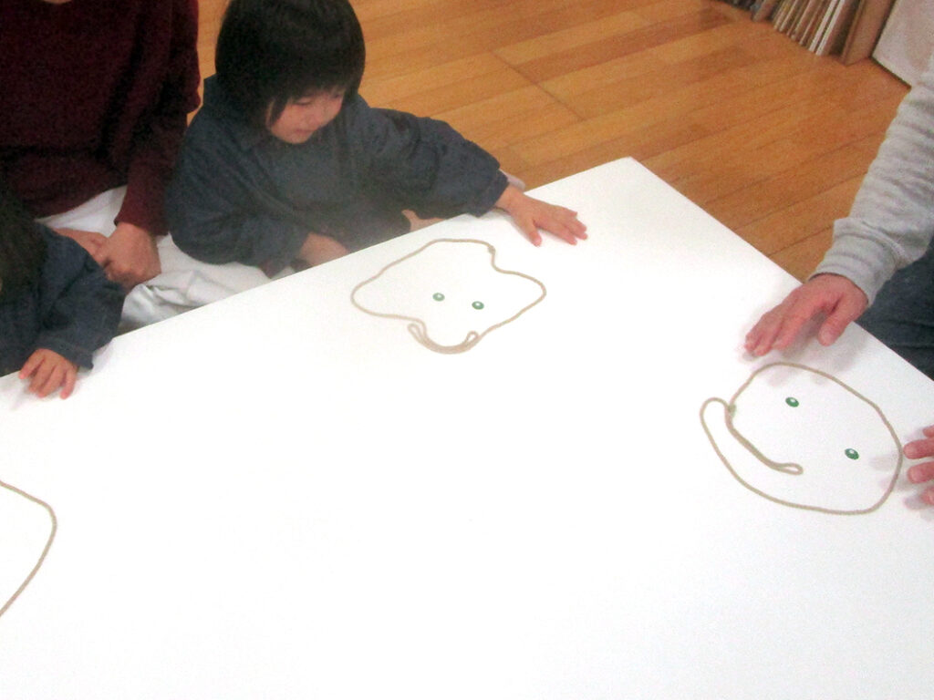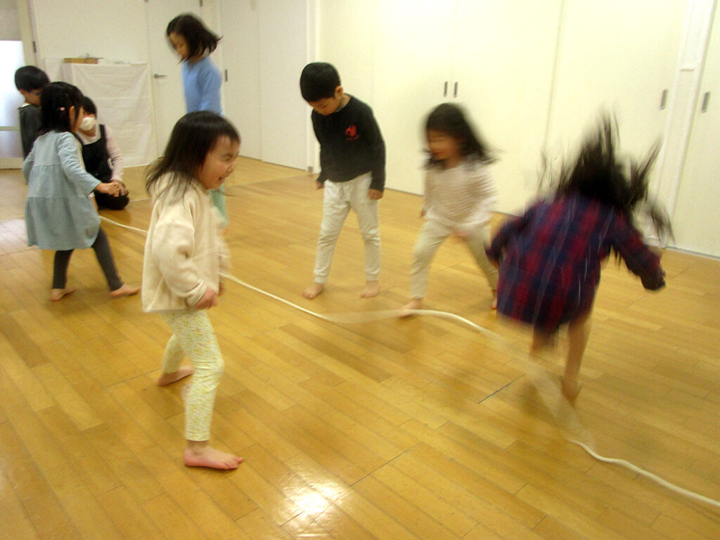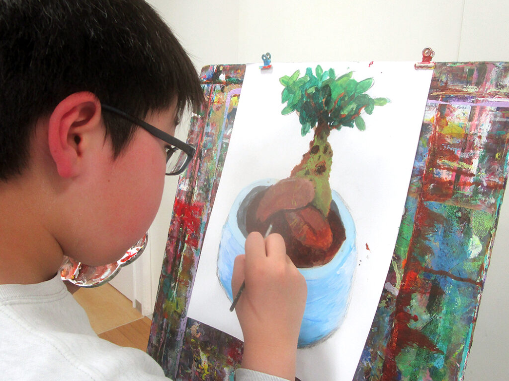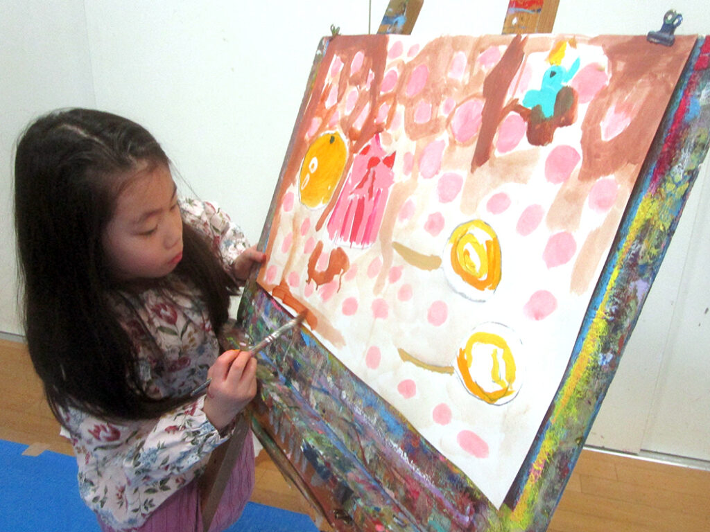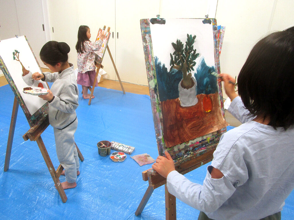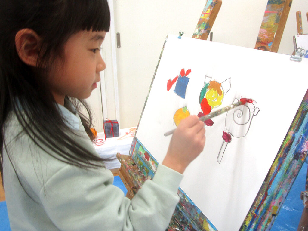 まずは体いっぱいロープ遊びで、線の世界を感じ取ったら絵画の開始です。今回はキャンディーや植物など線を感じられるモチーフです。画用紙に木炭で下描きをしてアクリル絵具で着彩。子ども達の人数分の答えが生まれます。今回も魅力あふれる世界がたくさん生まれました⭐︎