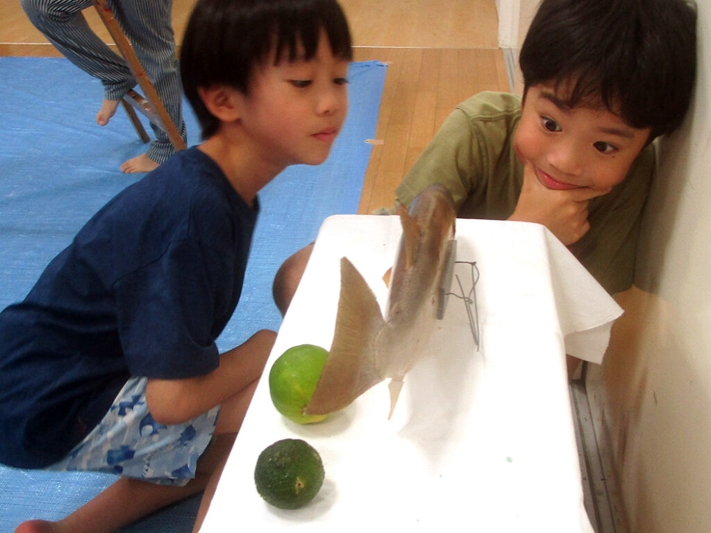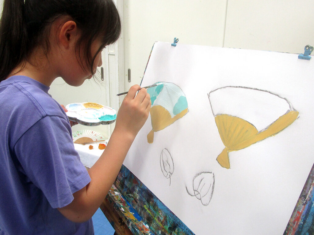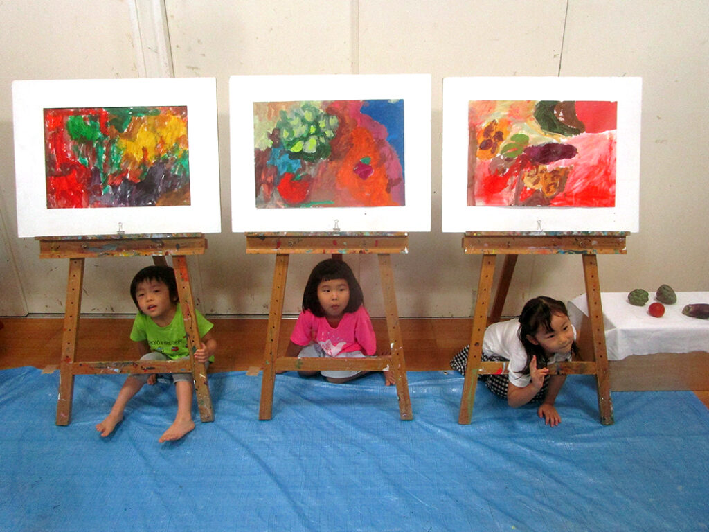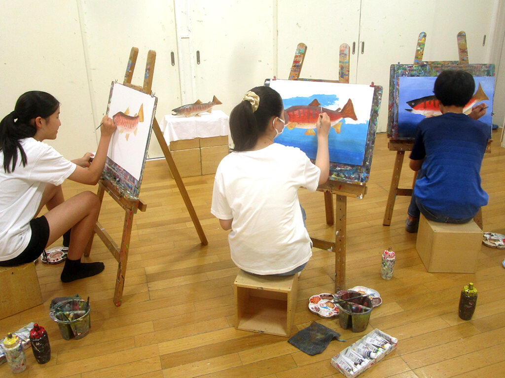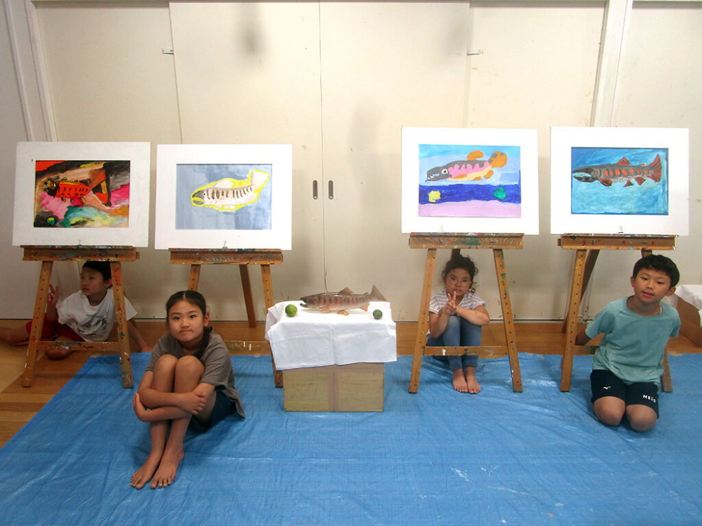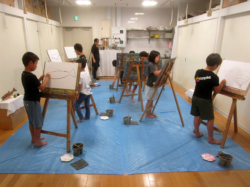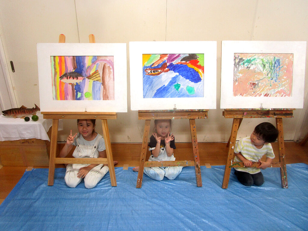 今回は夏の季節を感じられる多様な形のモチーフでの絵画です。夏野菜や扇子にホオズキ、マスの剥製。画用紙に木炭で下描きをしてアクリル絵具で着彩です。100人の子ども達がいたら100通りの答えが生まれる絵画の世界。今回も魅力あふれる世界がたくさん生まれました⭐︎