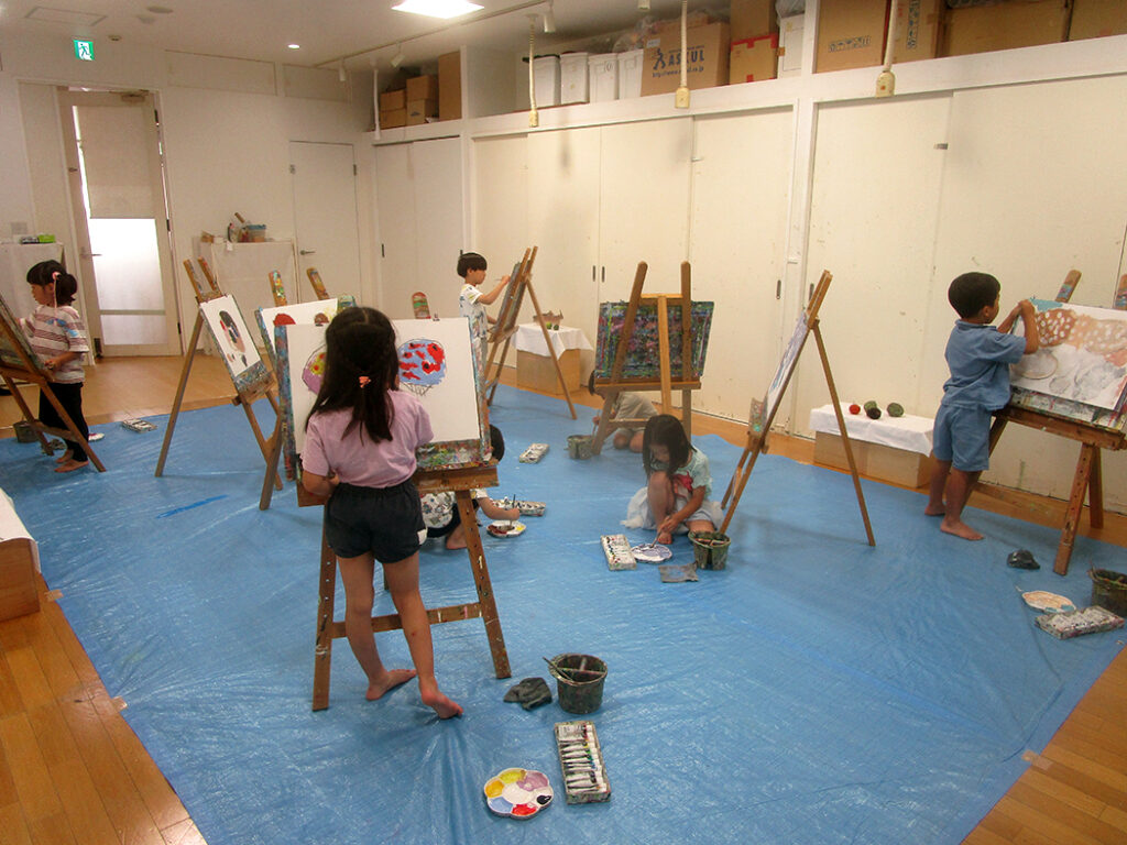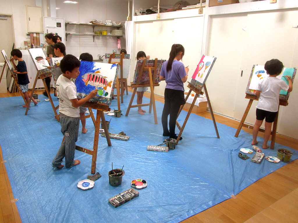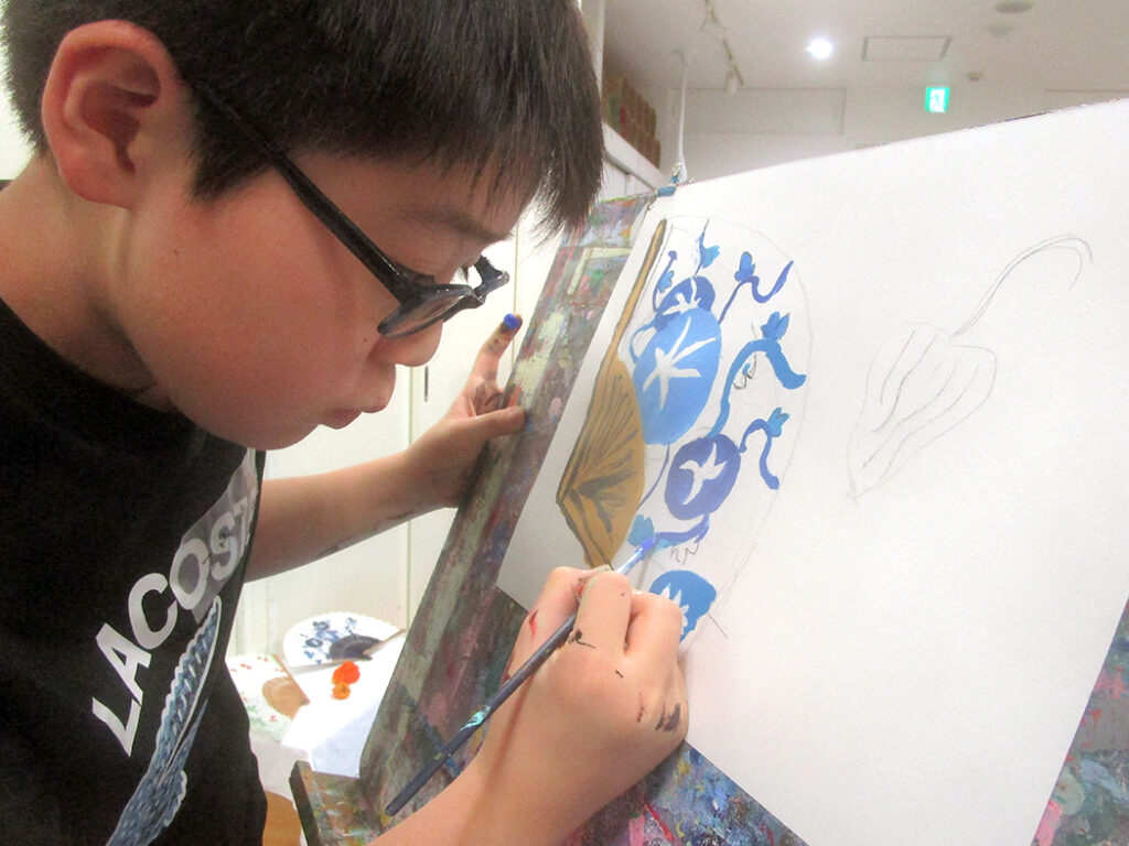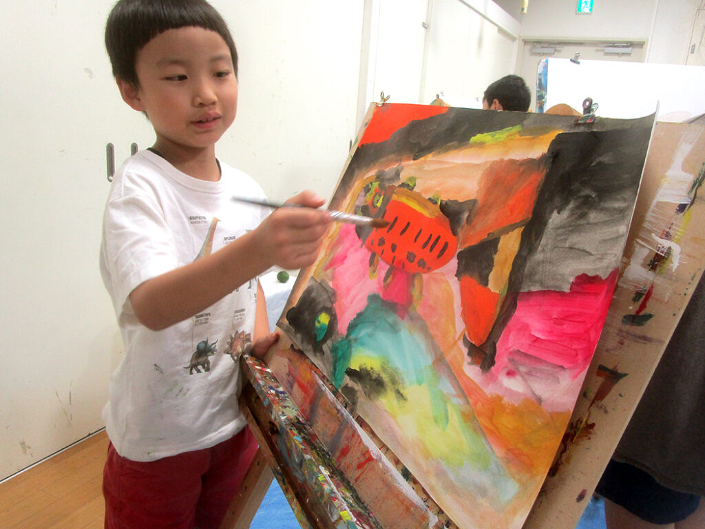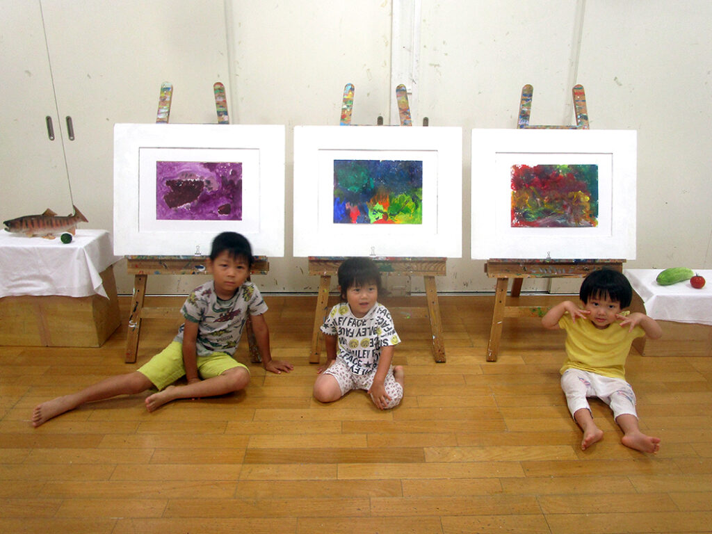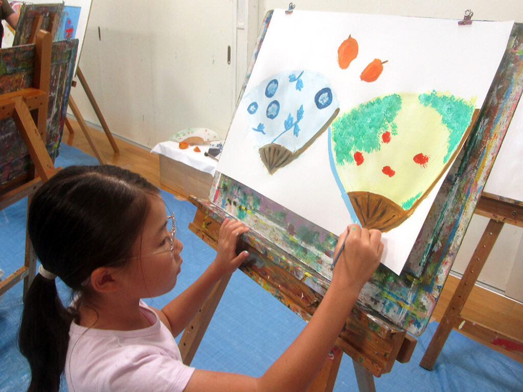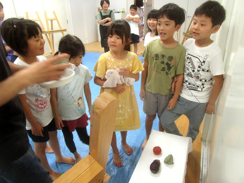 今回は夏の季節を感じられる多様な形のモチーフでの絵画です。夏野菜や扇子にホオズキ、マスの剥製。画用紙に木炭で下描きをしてアクリル絵具で着彩です。100人の子ども達がいたら100通りの答えが生まれる絵画の世界。今回も魅力あふれる世界がたくさん生まれました⭐︎