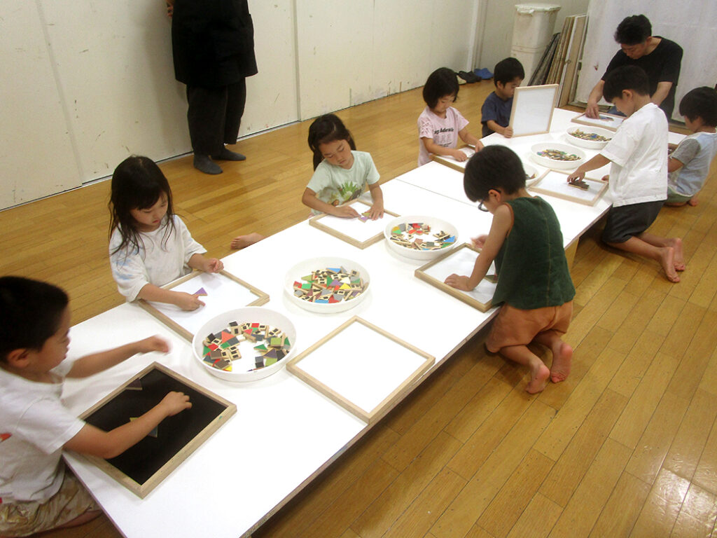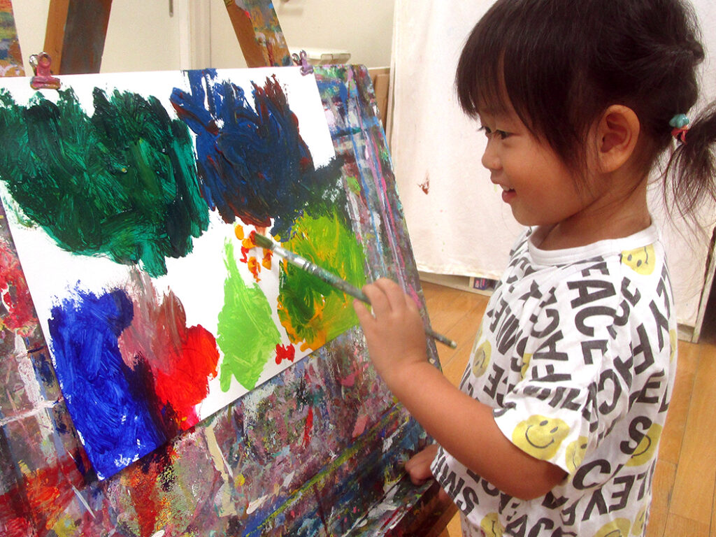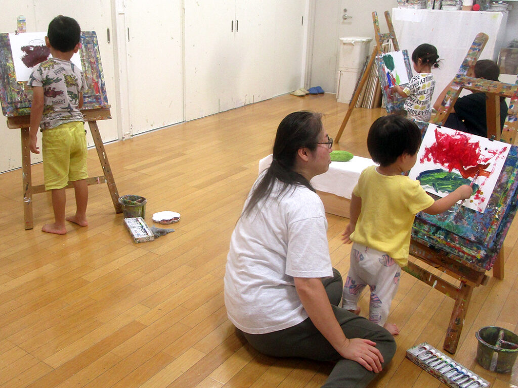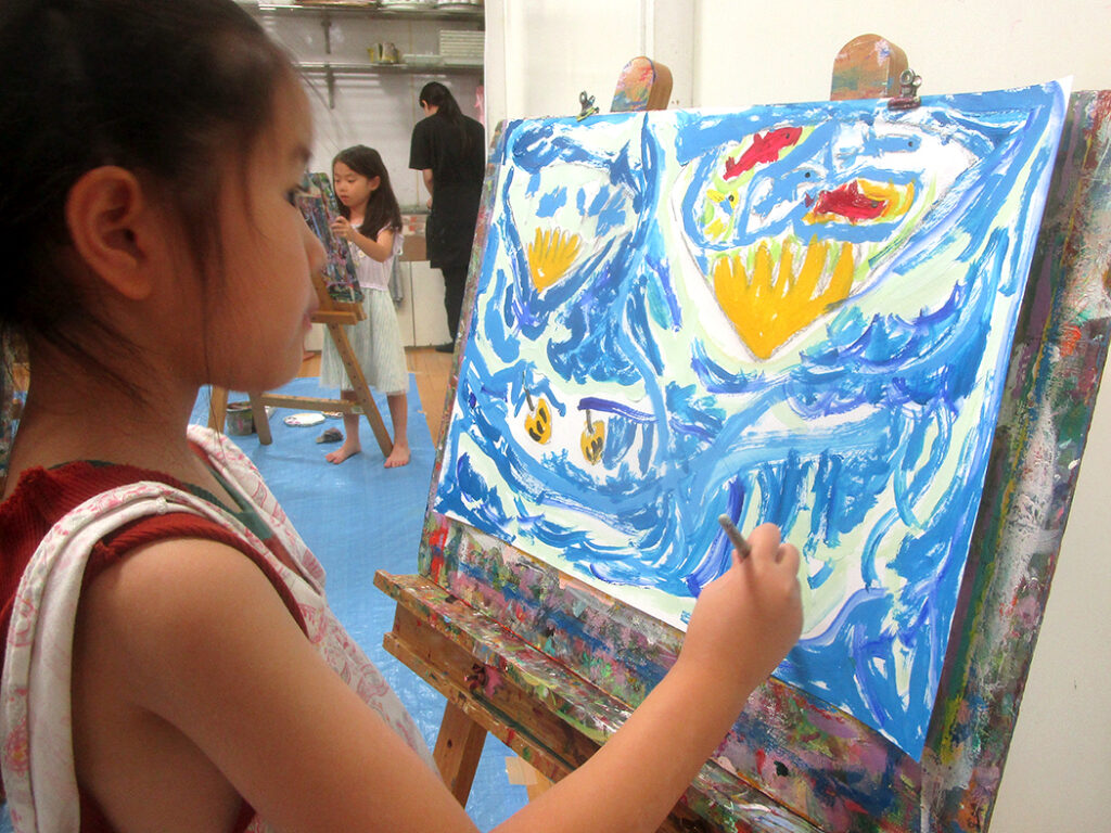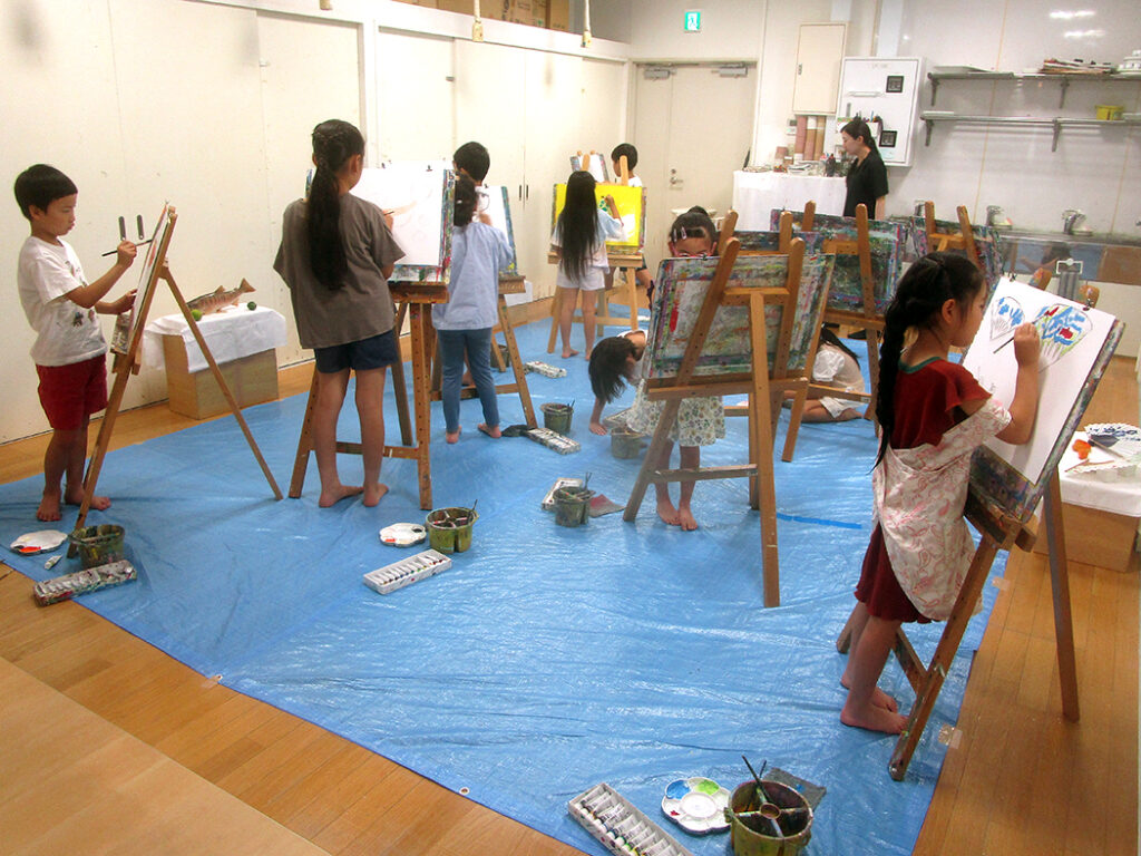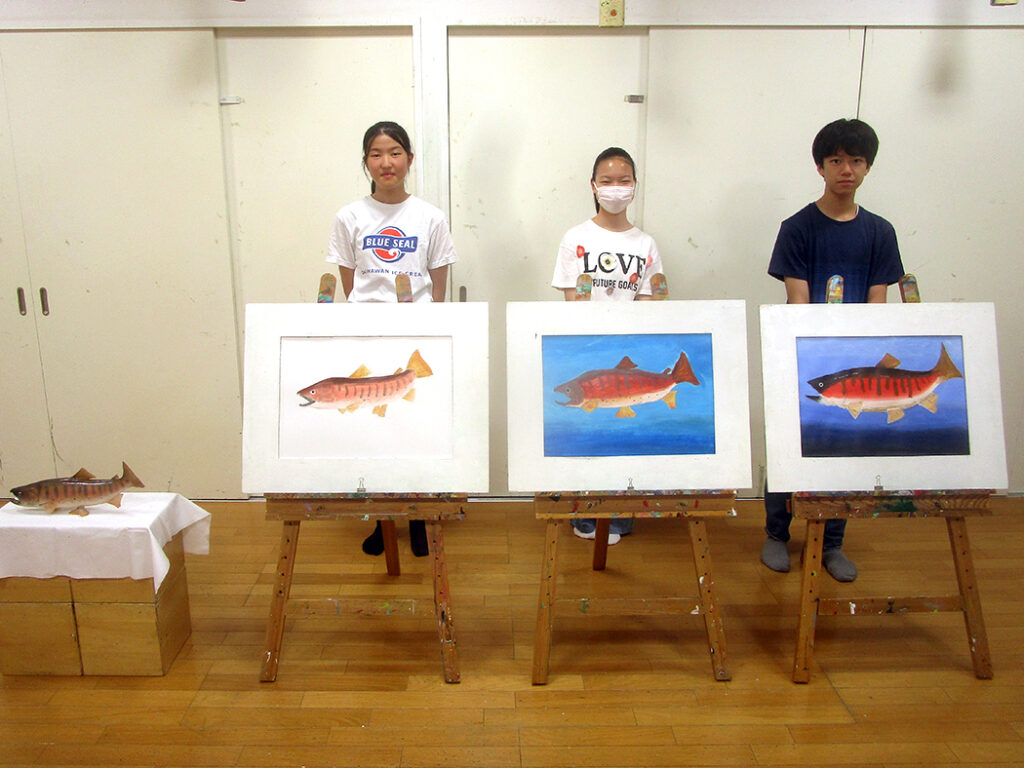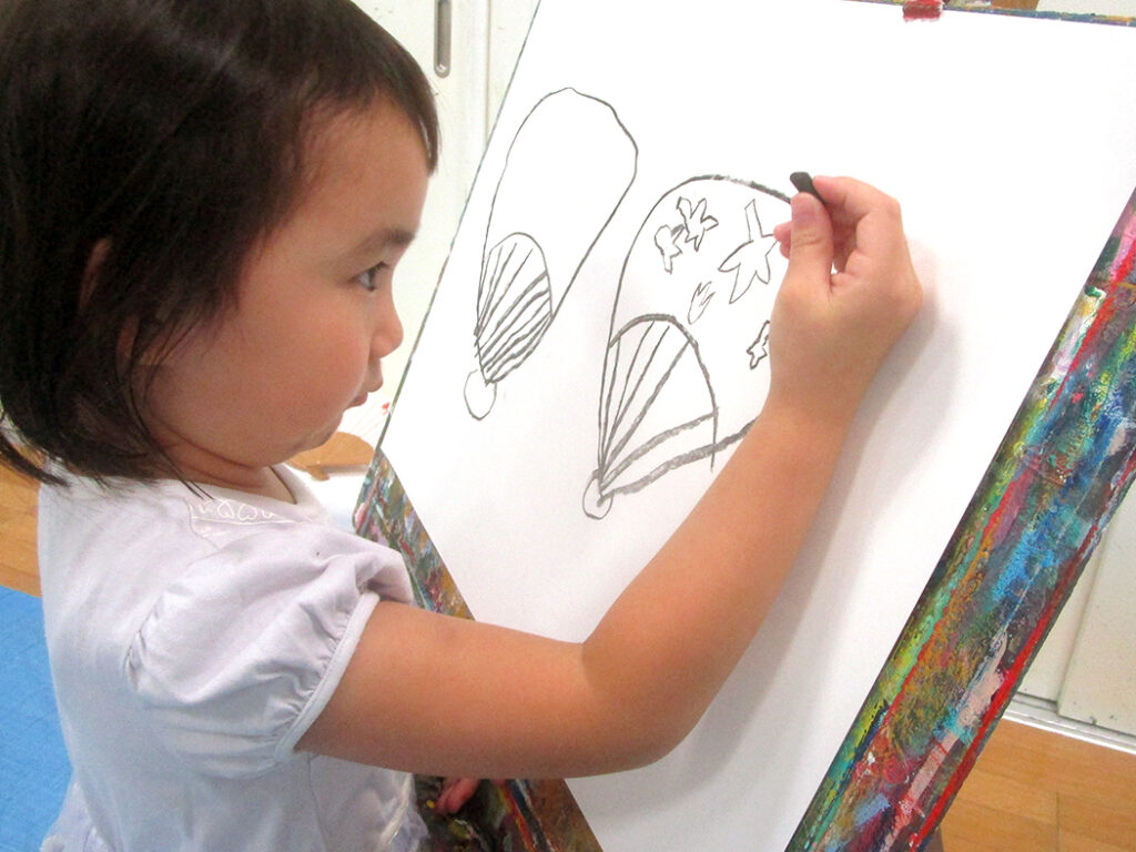 今回は夏の季節を感じられる多様な形のモチーフでの絵画です。夏野菜や扇子にホオズキ、マスの剥製。画用紙に木炭で下描きをしてアクリル絵具で着彩です。100人の子ども達がいたら100通りの答えが生まれる絵画の世界。今回も魅力あふれる世界がたくさん生まれました⭐︎