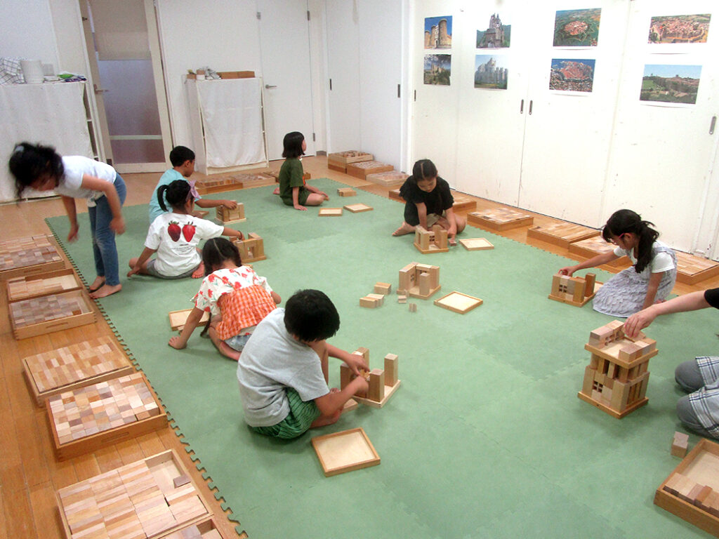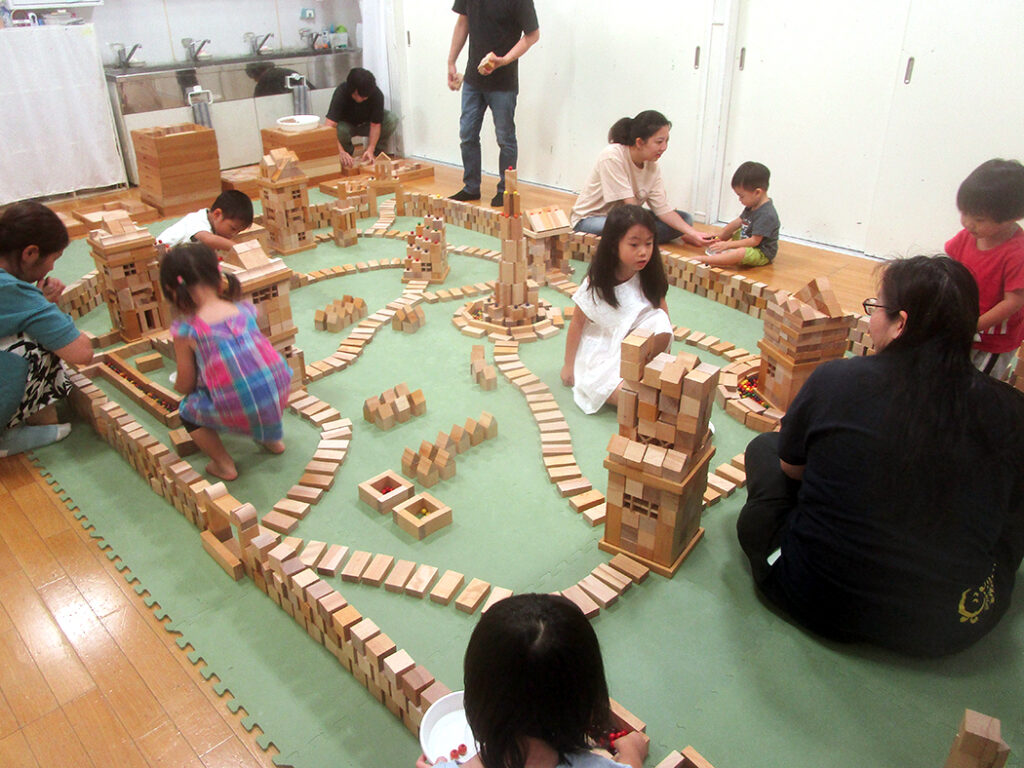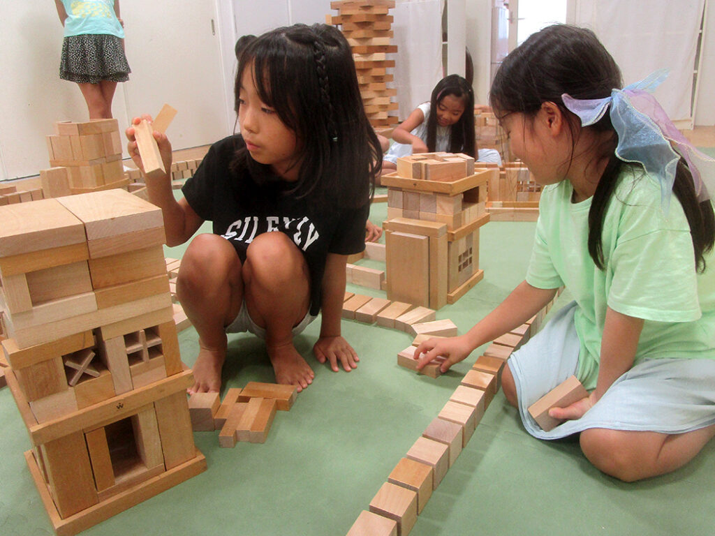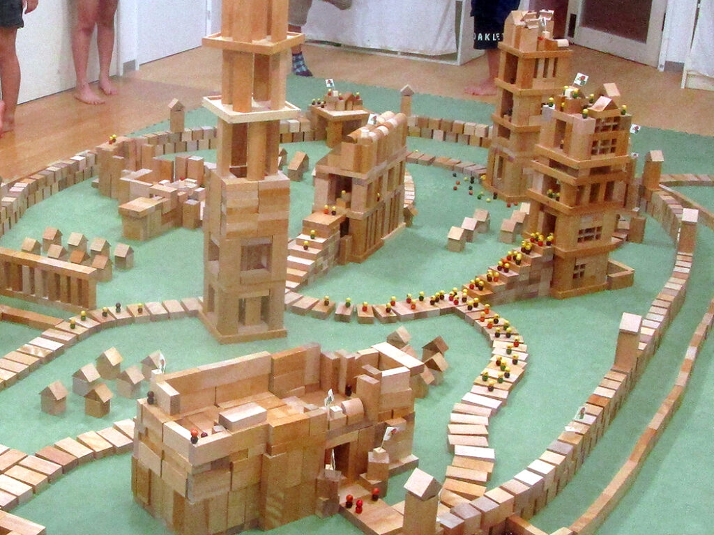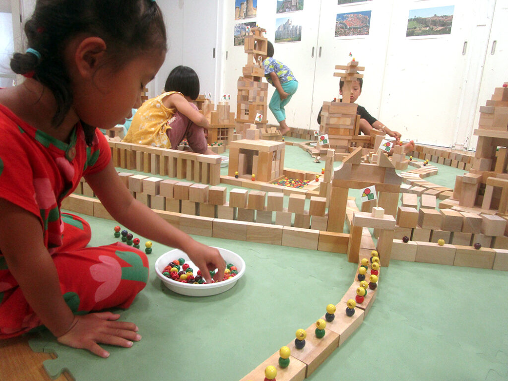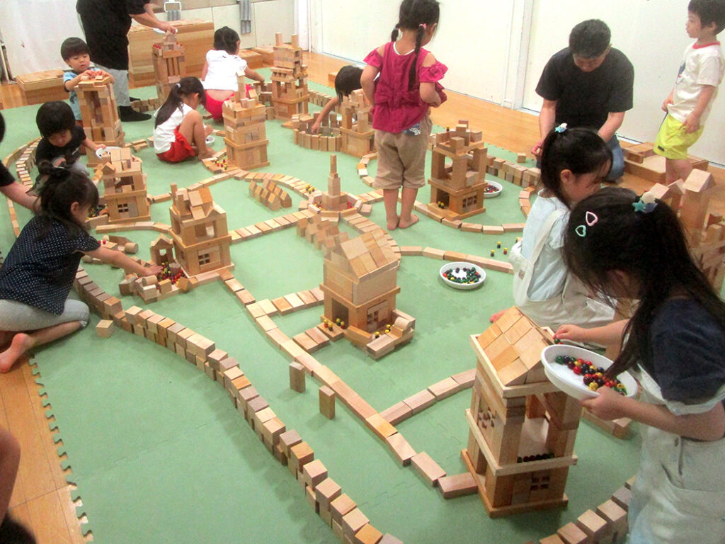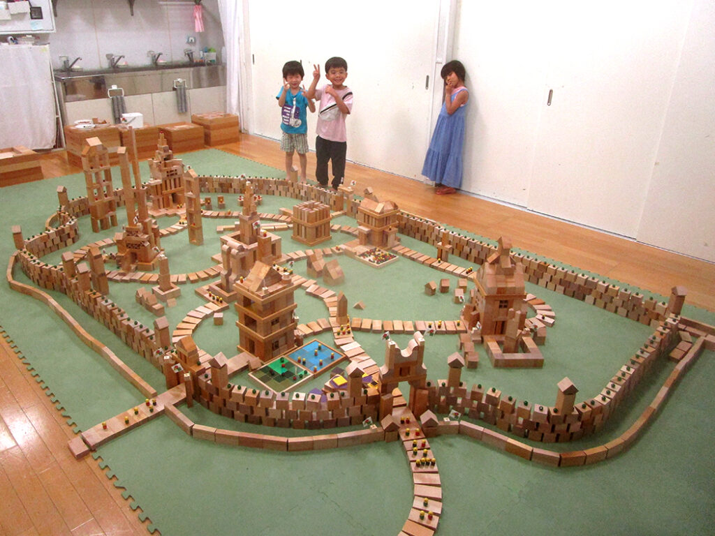 今回は様々な形の積木を使用して城郭都市づくりにチャレンジです。まずは一人一つ建物をつくり、みんなの建物がつながって、大きな城郭のある都市に仕上げます。いろいろな物語も生まれて、どこのクラスも迫力いっぱいな世界ができあがりました⭐︎