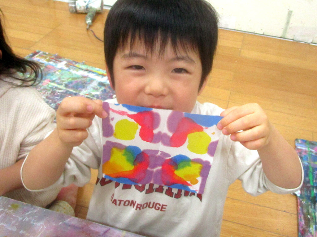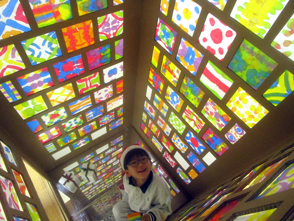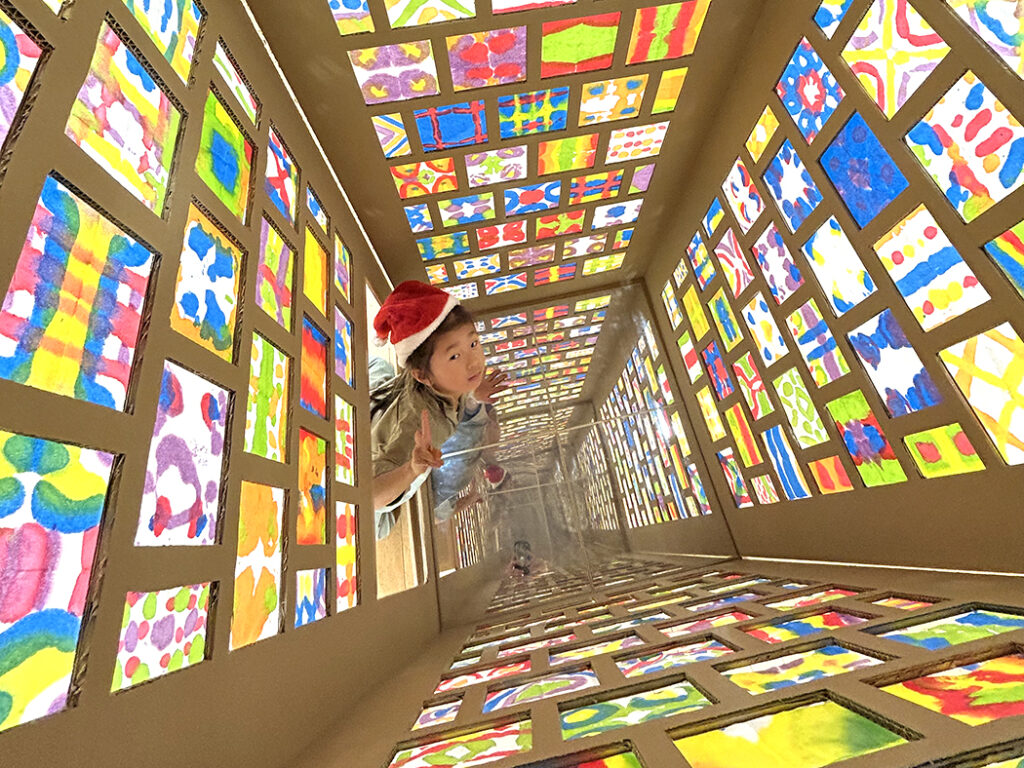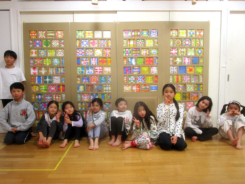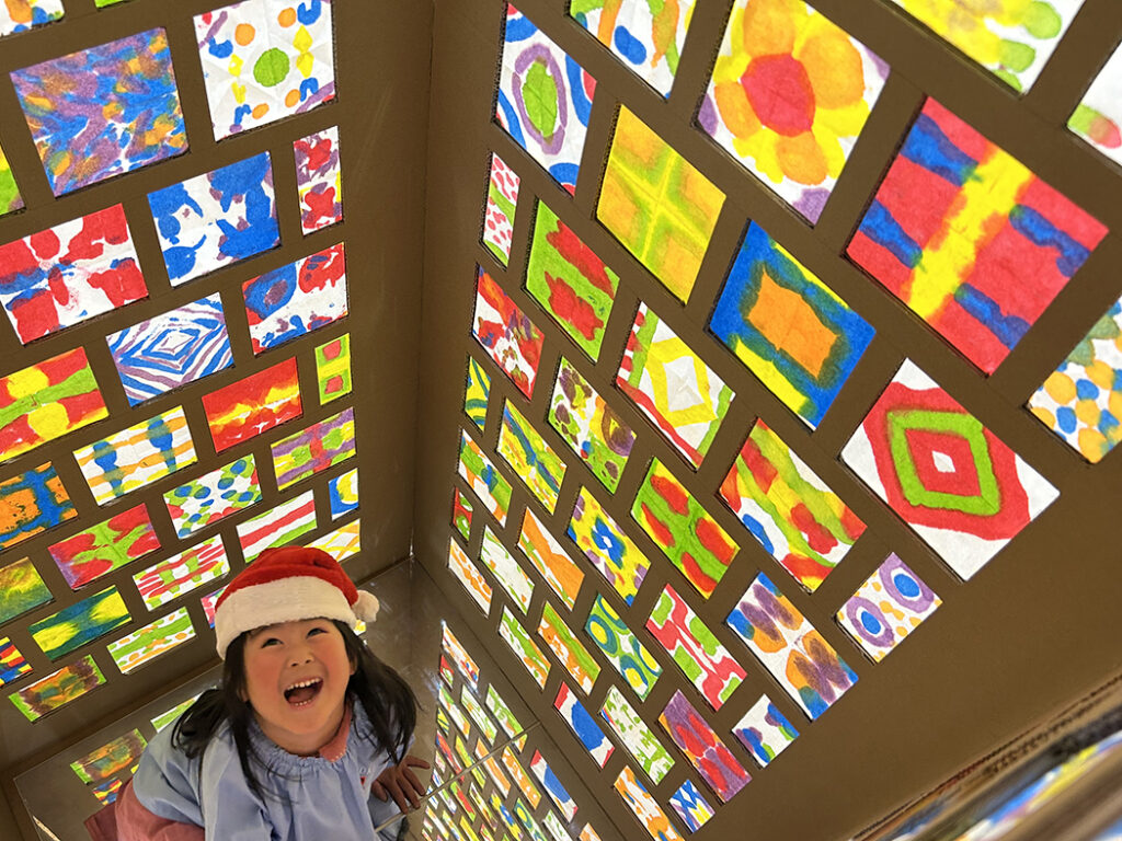 今回は正方形で色面空間づくりです。まずは偶然性いっぱいに模様をつくり、驚きと発見が生まれる時間です。そして完成した正方形を壁面に構成して幻想的な光の空間に⭐︎最後は子ども達がサンタクロースになって、笑顔いっぱい驚きいっぱいな時間になりました♪