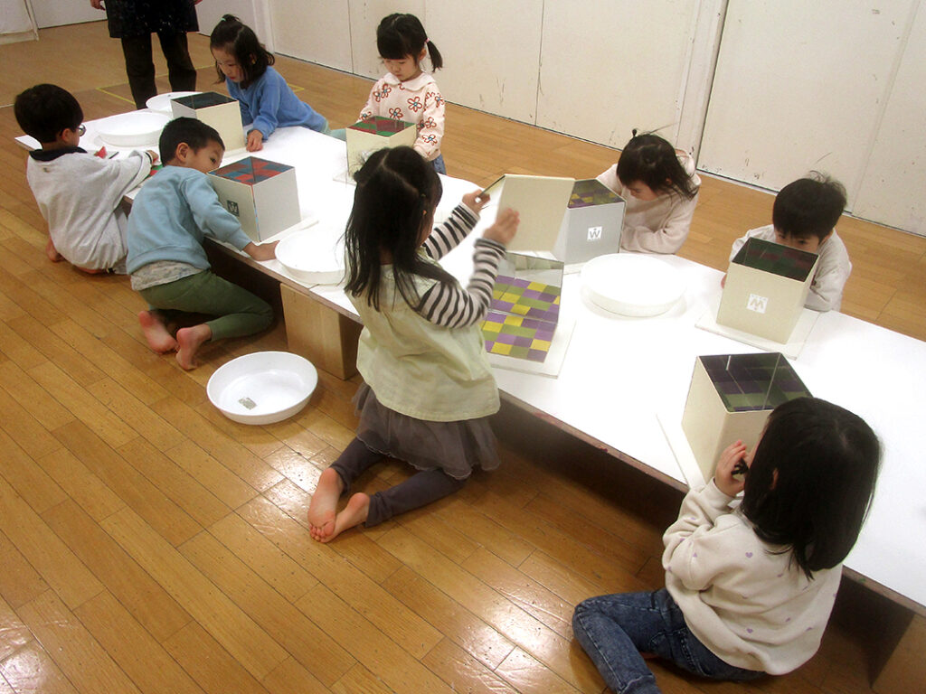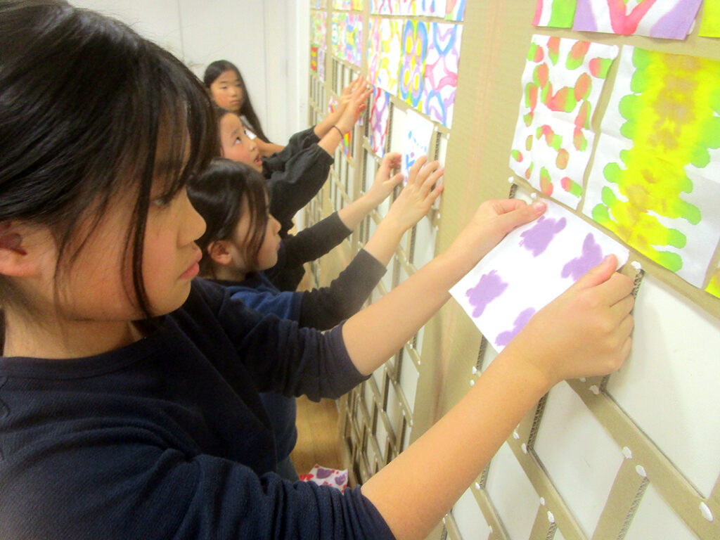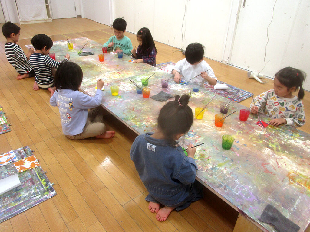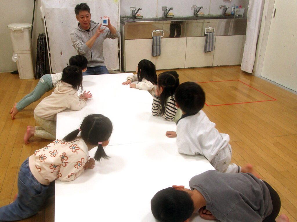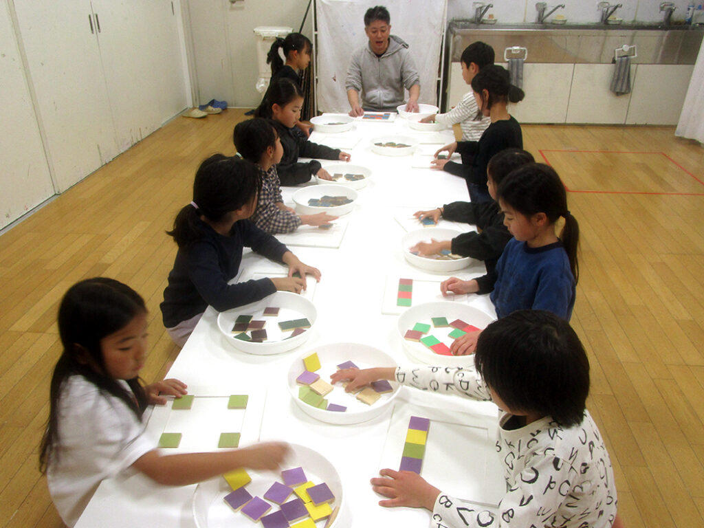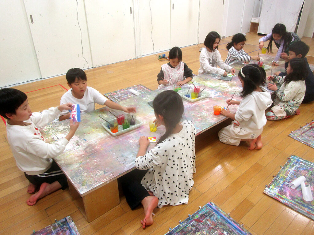 今回は正方形で色面空間づくりです。まずは偶然性いっぱいに模様をつくり、驚きと発見が生まれる時間です。そして完成した正方形を壁面に構成して幻想的な光の空間に⭐︎最後は子ども達がサンタクロースになって、笑顔いっぱい驚きいっぱいな時間になりました♪