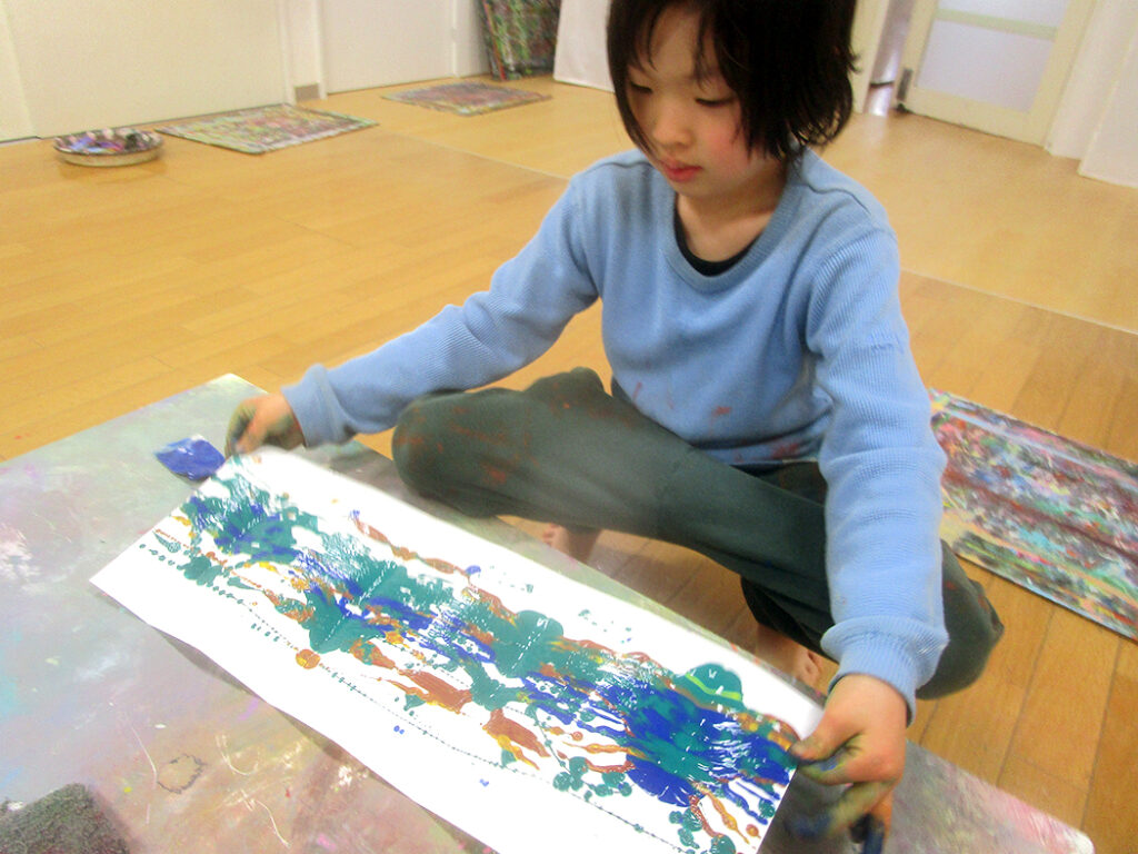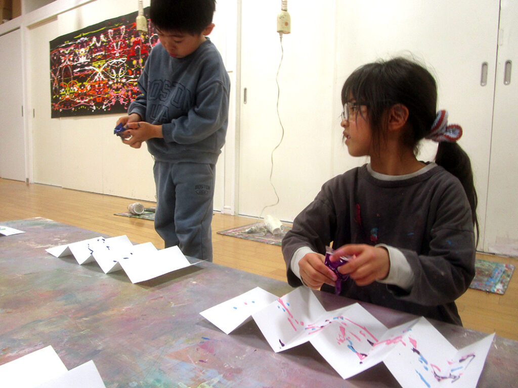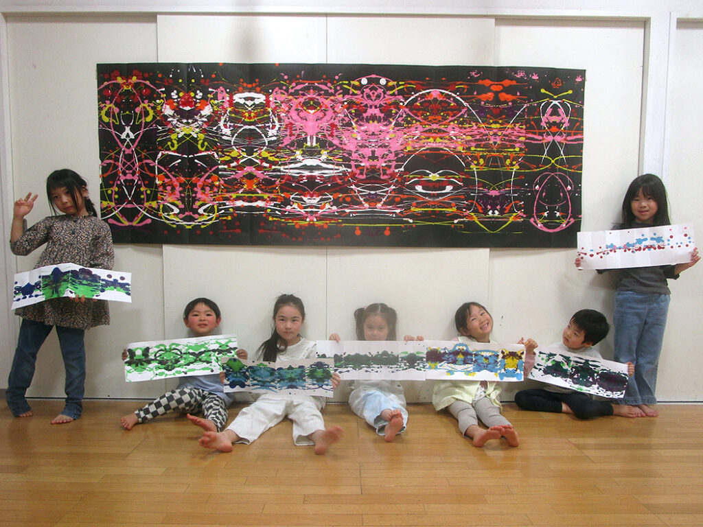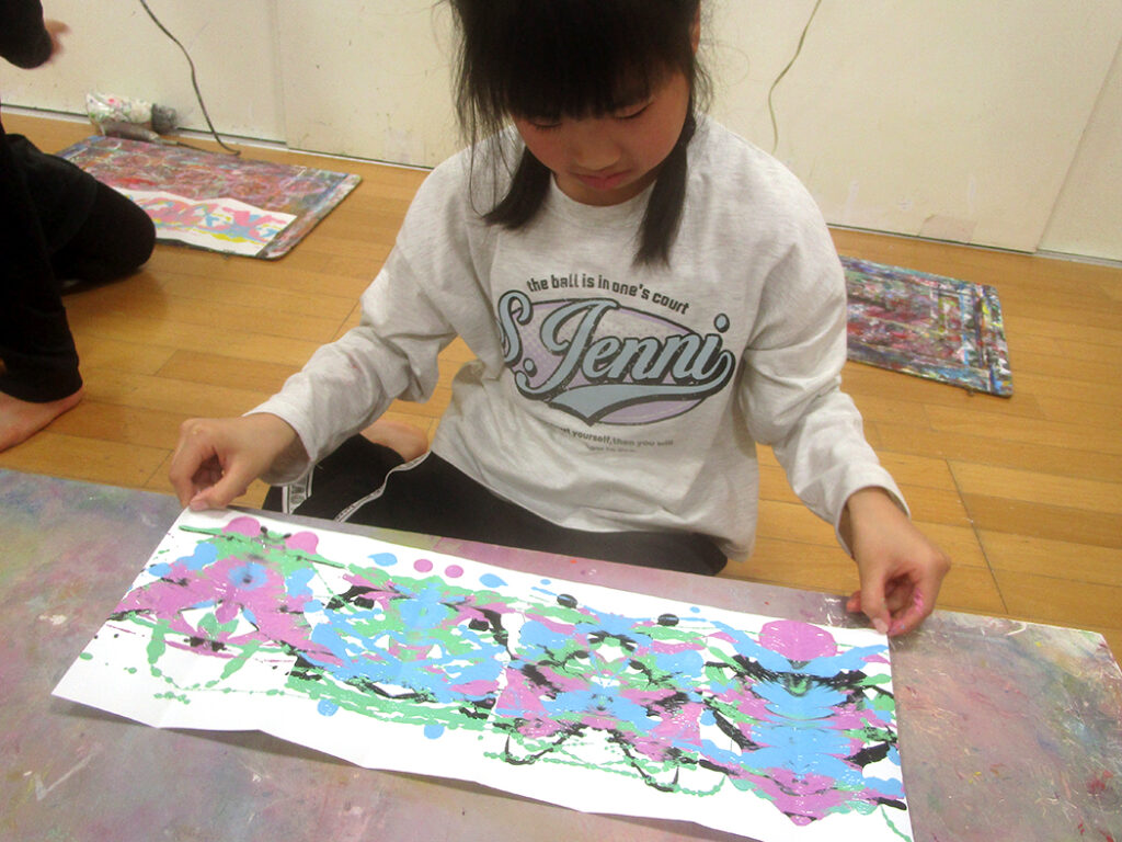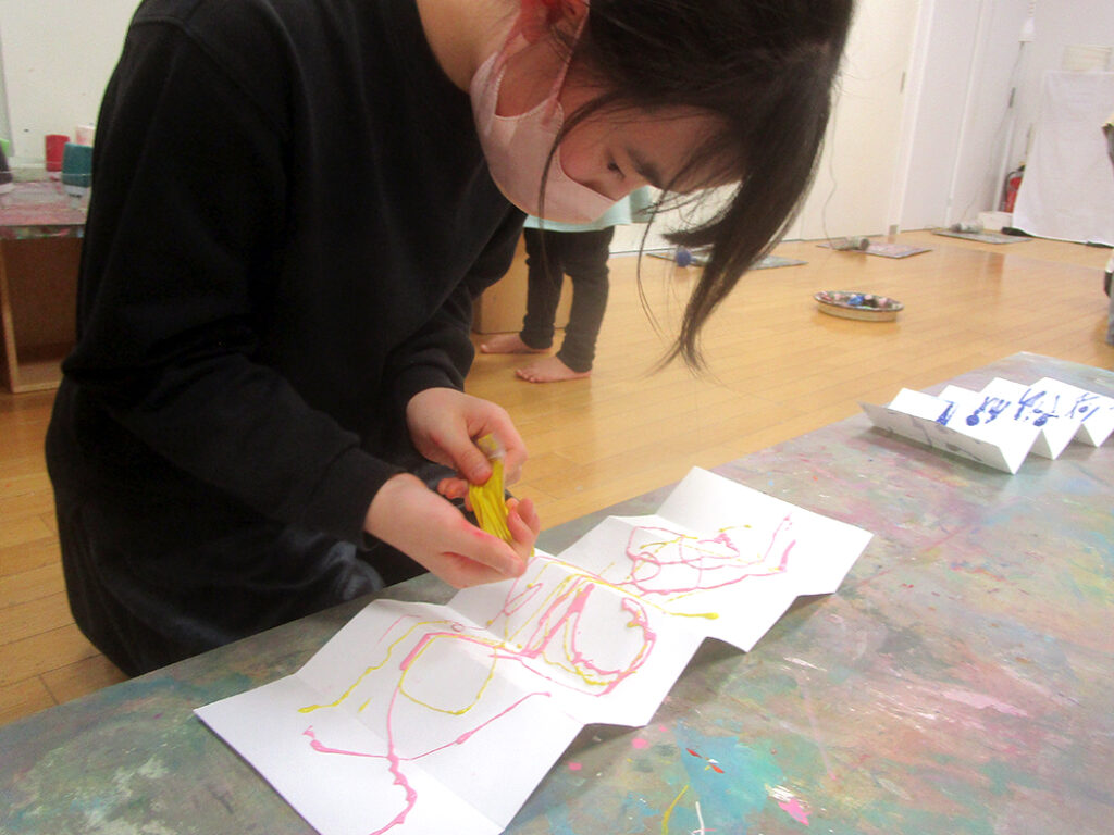 まずは円弧モザイクの遊びで線の世界の表現を楽しんだら制作開始です。今回は転写活動。画面いっぱいに線を表現して屏風折に転写します。偶然性いっぱいに迫力満点⭐︎驚き満点⭐︎な世界がたくさん生まれました⭐︎