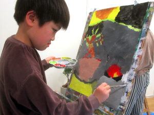 横浜港北プレイルーム 2026.02.① <絵画 ペロペロキャンディー/ガジュマル/ユッカエレファンティパス> 〜線を感じられるモチーフを絵画で表現しました〜 まずは体いっぱいロープ遊びで、線の世界を感じ取ったら絵画の開 …